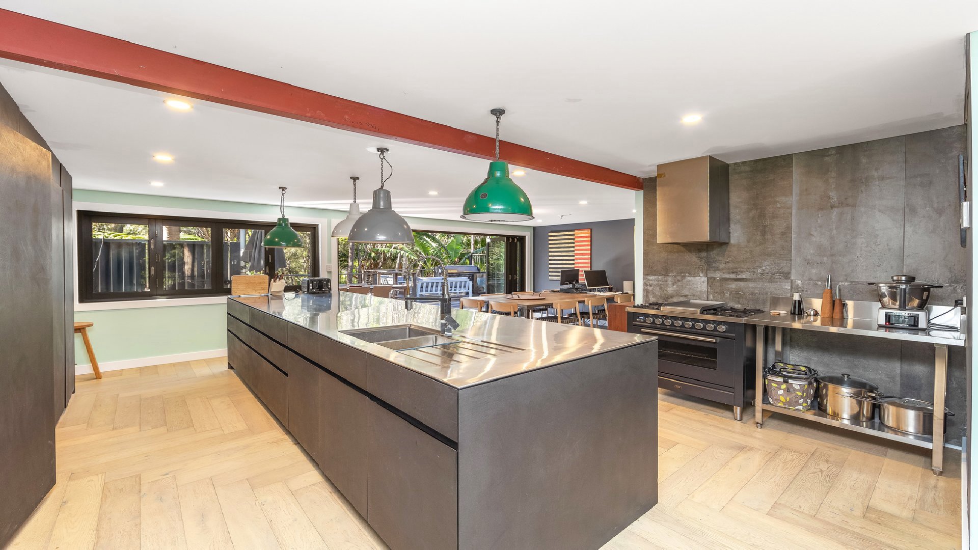 - Modern kitchen has gas cooktop, dishwasher, fridge and dining for 10