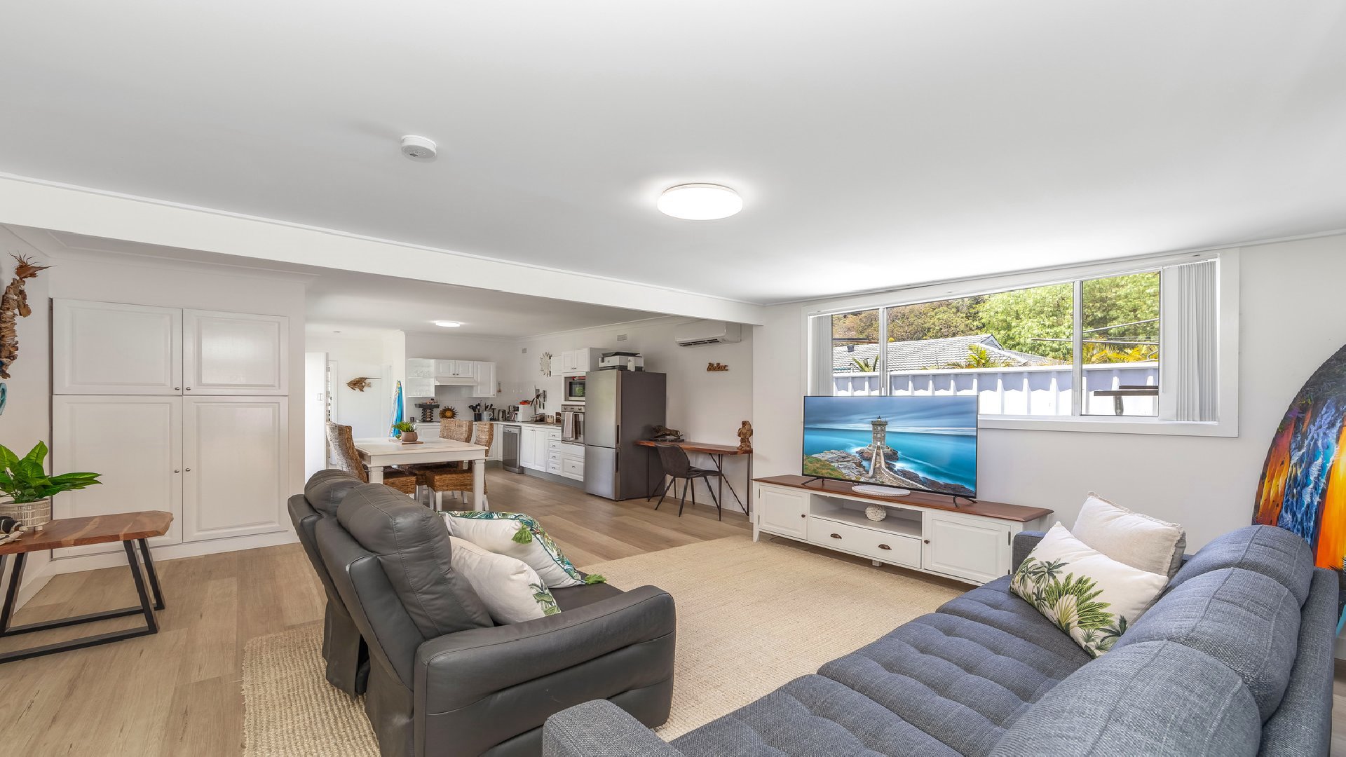 - Open plan living features a smart TV, and comfortable lounges and split system air con