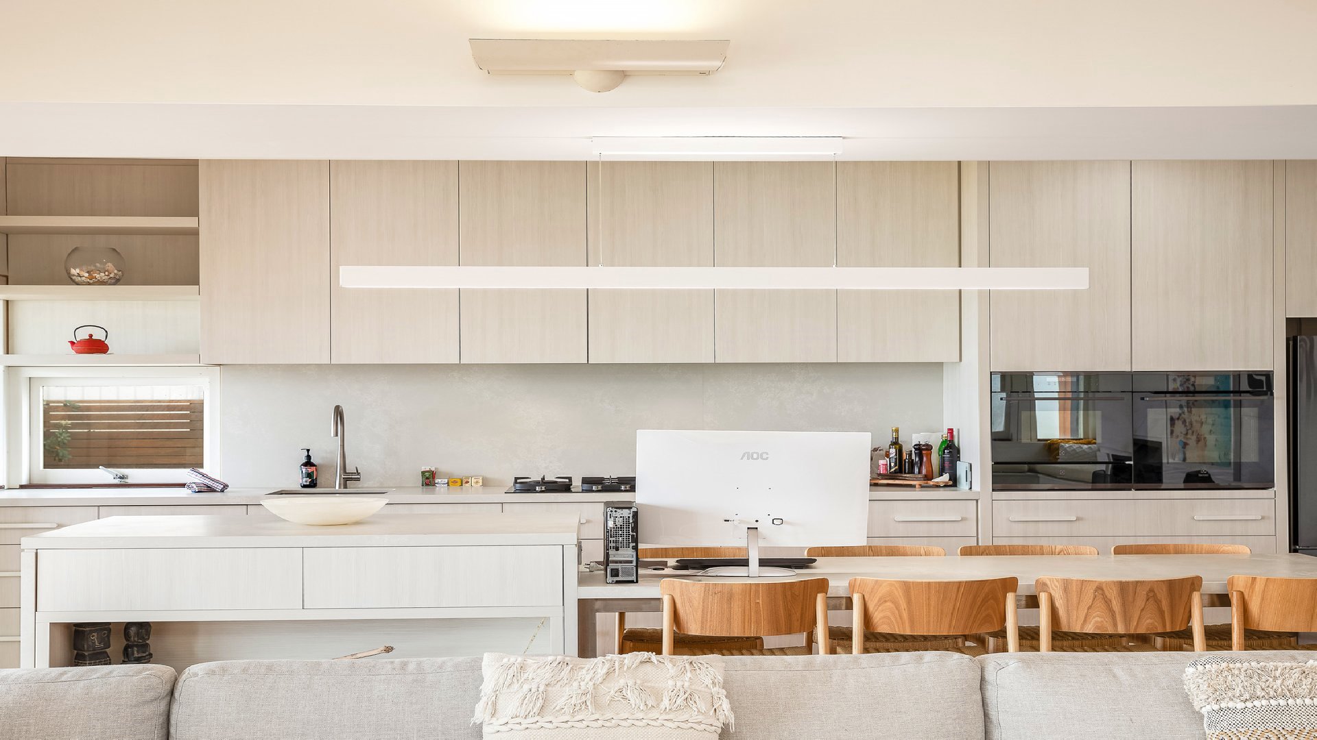 Designed with both style and comfort in mind, the property features quality minimalist finishes, making it ideal for large families. The spacious upstairs area showcases striking timber floors and soaring high ceilings, all while framing panoramic beach views visible from every corner of the living space. Here, you'll find the master suite, which opens to a private, elevated deck for a peaceful retreat, alongside two additional bedrooms and a stylish bathroom. The open-plan kitchen, dining, and living area provides the perfect setting for both everyday relaxation and entertaining.